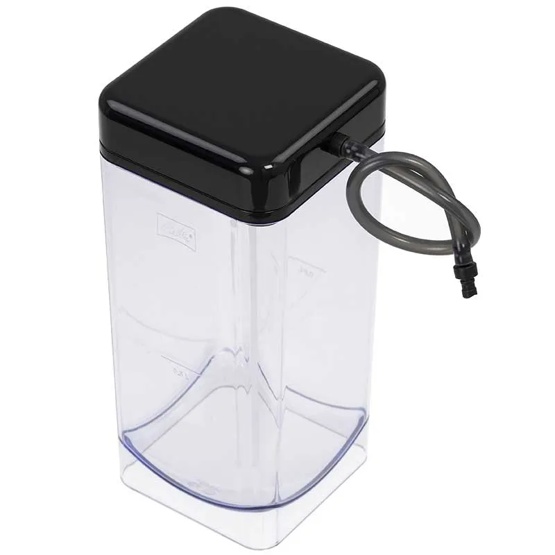 Milchbehälter mit schwarzem Deckel, Milcheinlaufrohr und Aufschäumschlauch für Melitta Caffeo Barista Kaffeevollautomaten. Die neueste Version hat die Melitta Produktnummer: 6764994.
