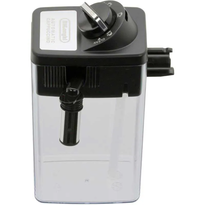 Nádoba na mléko DeLonghi s víkem, automatickým napěňovačem cappuccina a přívodní trubicí na mléko. Víko na nádobu (automatické cappuccino) není k dispozici samostatně, pouze kompletní se zásobníkem na mléko, jak je zde nabízeno. Dodává se vždy nejnovější verze karafy na mléko.